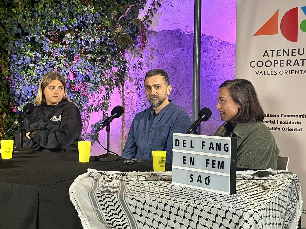 La trobada va acollir la xerrada-pòdcast en viu “Reprendre la vida després de la DANA”, una conversa profunda i colpidora entre Laia Gordi, de la cooperativa cultural valenciana Neu al Carrer, el cantautor Feliu Ventura i Frida Mateu, representant de les Brigades dels Casals i Ateneus dels Països Catalans, conduïda per Andrea Lizana i enregistrada per Ràdio Intermitent.